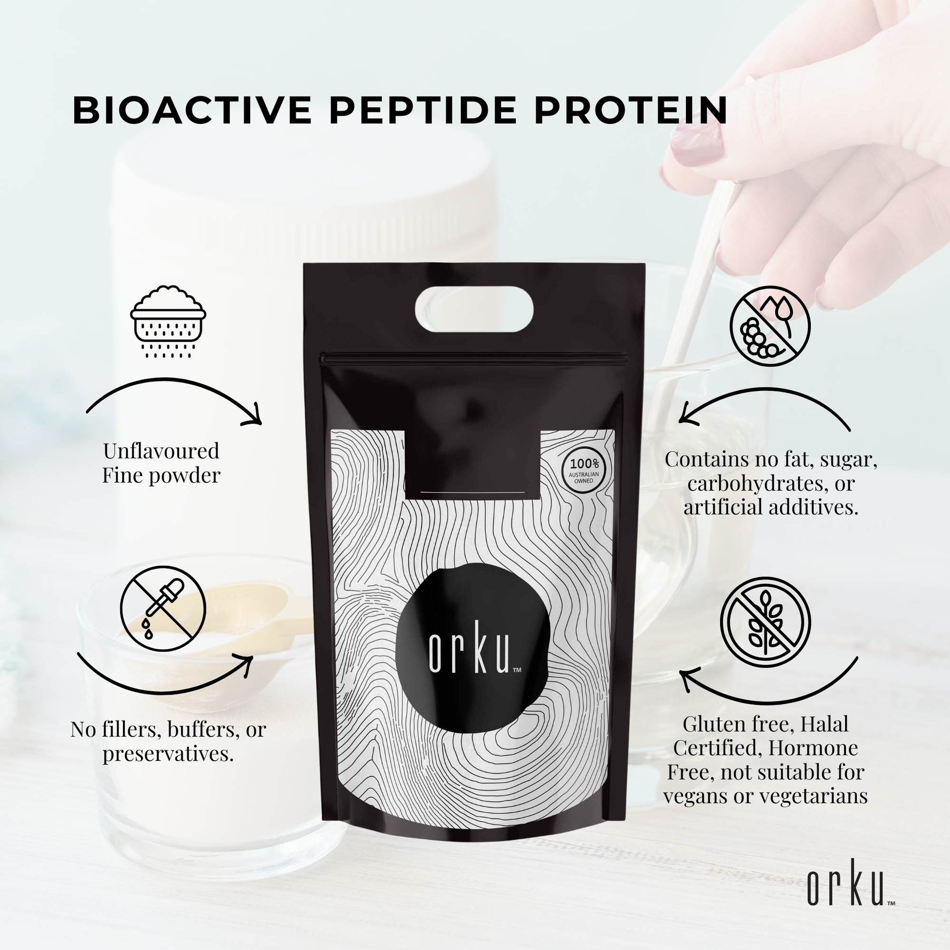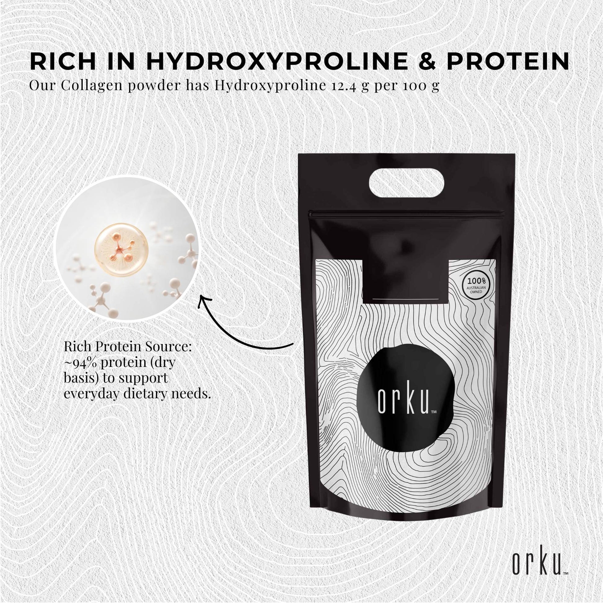 Orku Bovine Collagen Peptides is a pure, hydrolysed protein powder made from premium bovine hides. The collagen is broken down into small peptides (500–10,000 Da) for easy mixing and efficient digestion. With ~94% protein and no fillers, flavours, or additives, it’s a clean, versatile addition to your daily nutrition.